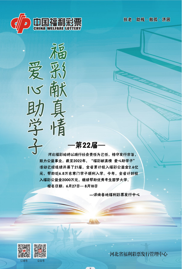 截至2022年,“福彩献真情 爱心助学子”活动已经连续举办了21届。全省福彩系统共投入2.6亿元,资助了近6.8万名困难家庭学生圆梦大学。如今,“福彩献真情 爱心助学子”活动已经成为助力我省改善民生、促进社会和谐的公益品牌。作为全国福彩系统开展时间最早、持续时间最长、投入资金最大、资助人数最多、社会影响最广的公益活动,“福彩献真情 爱心助学子”活动成为了全国福彩公益事业的一面旗帜。今年年初,“福彩献真情 爱心助学子”项目荣获了首届“河北慈善奖”。(孟保国)