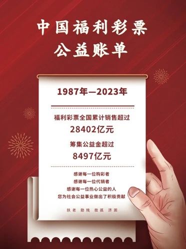 2023年,中国福利彩票共销售1944.41亿元,筹集公益金超580亿元,公益金筹集率达29.83%。1987年—2023年,福利彩票全国累计销售超过28402亿元,筹集公益金超过8497亿元,为促进社会公益事业发展提供了资金支持,发挥了重要作用。
