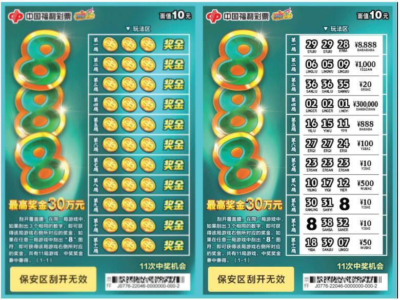 “888”面值10元,共有10个奖级、11次中奖机会,最高奖金30万元。