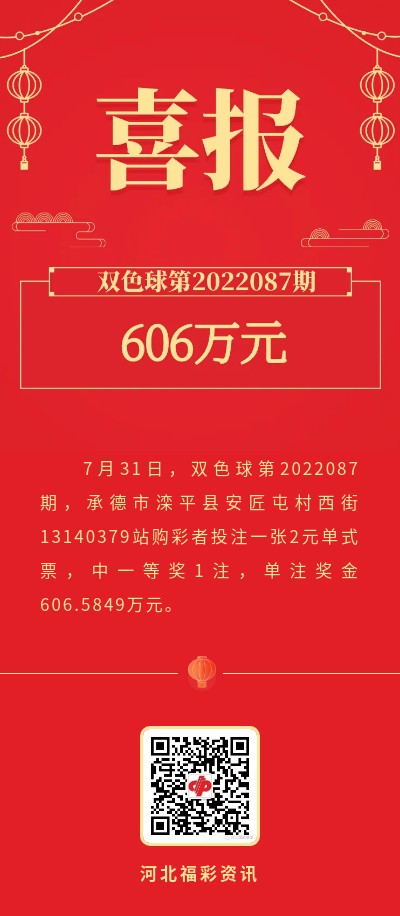 7月31日,双色球第2022087期,承德市滦平县安匠屯村西街13140379站购彩者投注一张2元单式票,中一等奖1注,单注奖金606.5849万元。