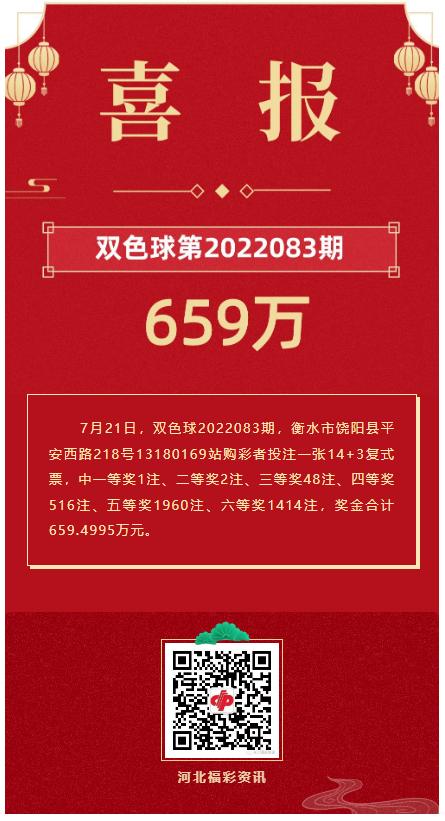 7月21日,双色球2022083期,衡水市饶阳县平安西路218号13180169站购彩者投注一张14+3复式票,中一等奖1注、二等奖2注、三等奖48注、四等奖516注、五等奖1960注、六等奖1414注,奖金合计659.4995万元。
