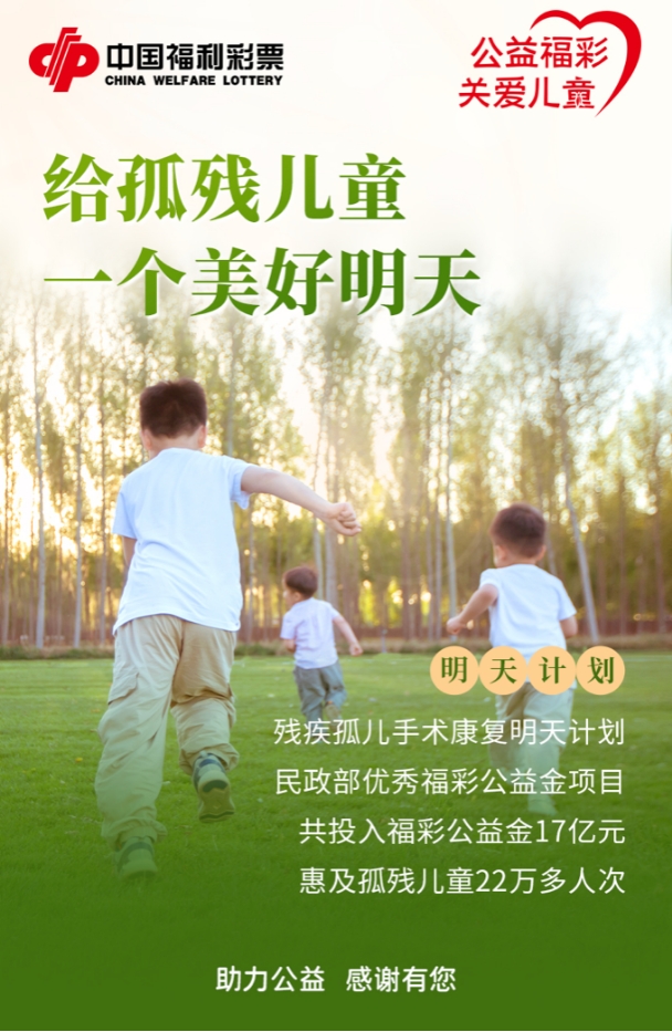 儿童象征着希望与美好,是国家和民族的未来。但有这样一批孩子,他们有的身患残疾,有的被遗弃,需要更多关注和关爱。近年来,福利彩票在参与孤残儿童救助中扮演着越来越重要的角色,不断尝试发挥公益金的优势和作用,提高救助能力,协助政府解决不同类型的孤残儿童问题,以最大的力量汇集社会公众力量,共同参与社会救助工作,力争成为每一个孤残儿童健康快乐成长的有力后盾。