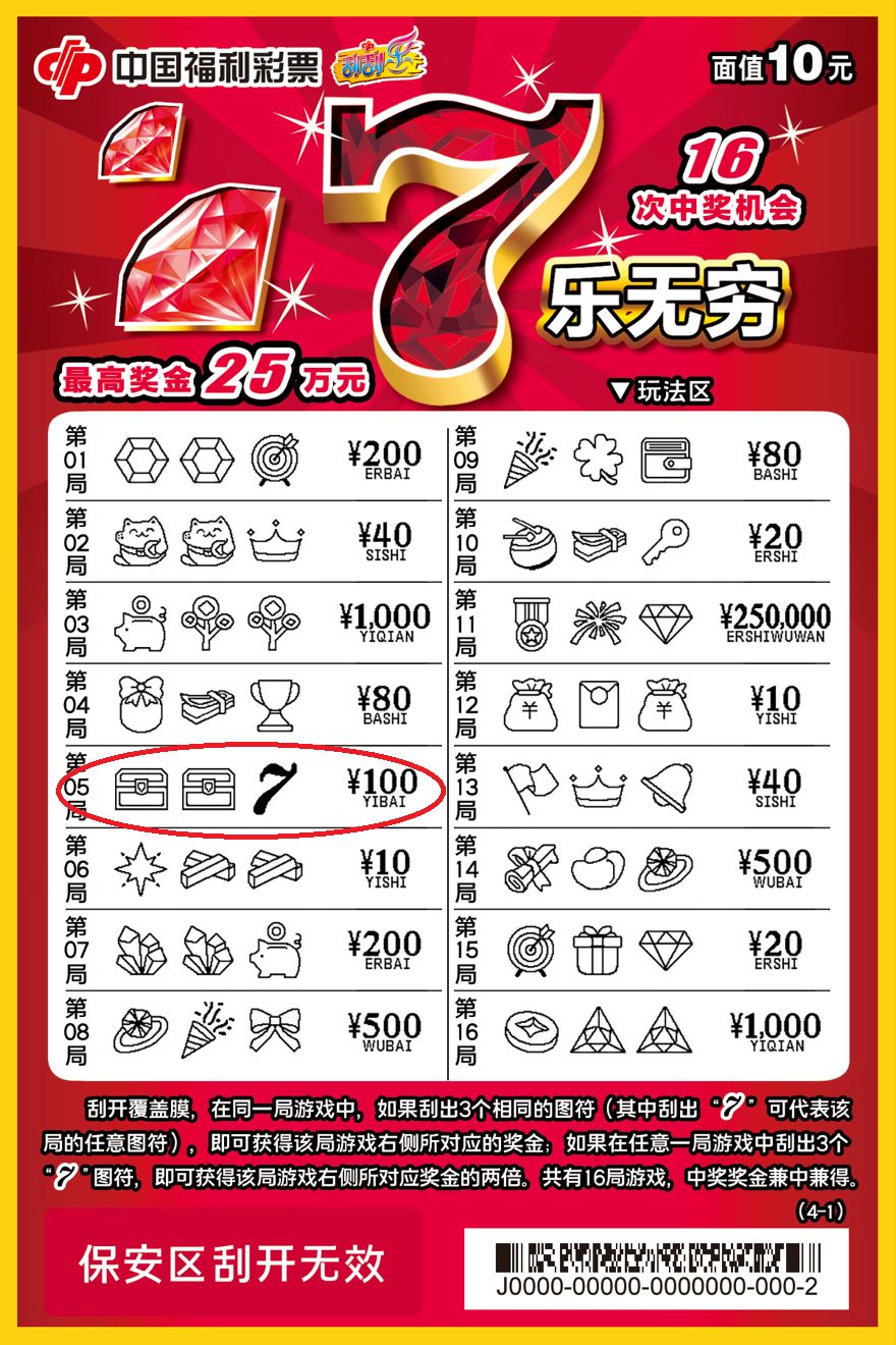 “7乐无穷10元”面值10元,共设9个奖级、16次中奖机会,最高奖金25万元。