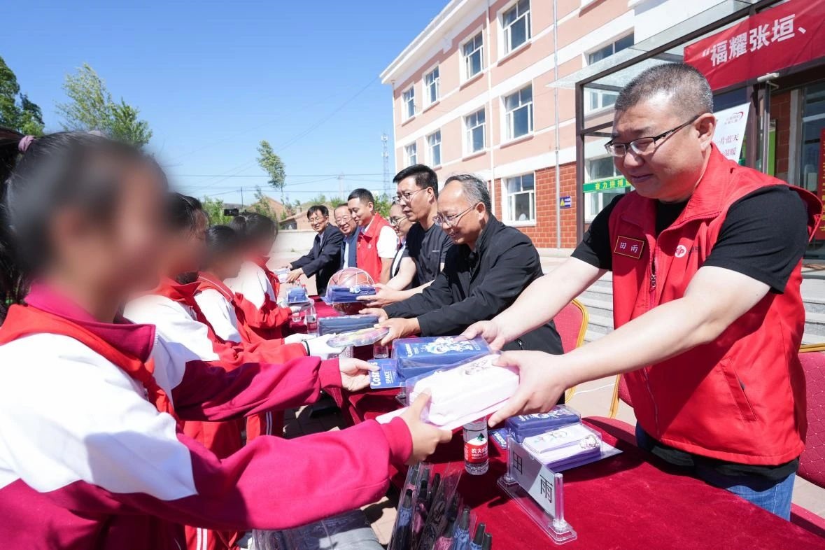 在儿童节前夕,张家口市福彩中心的工作人员带着满满的爱心走进尚义县小蒜沟镇中心小学,为困难家庭学生和农村留守儿童捐赠了书包、文具和体育用品,并与孩子们一起欢度六一儿童节,鼓励他们健康成长,将来为祖国建设贡献力量。