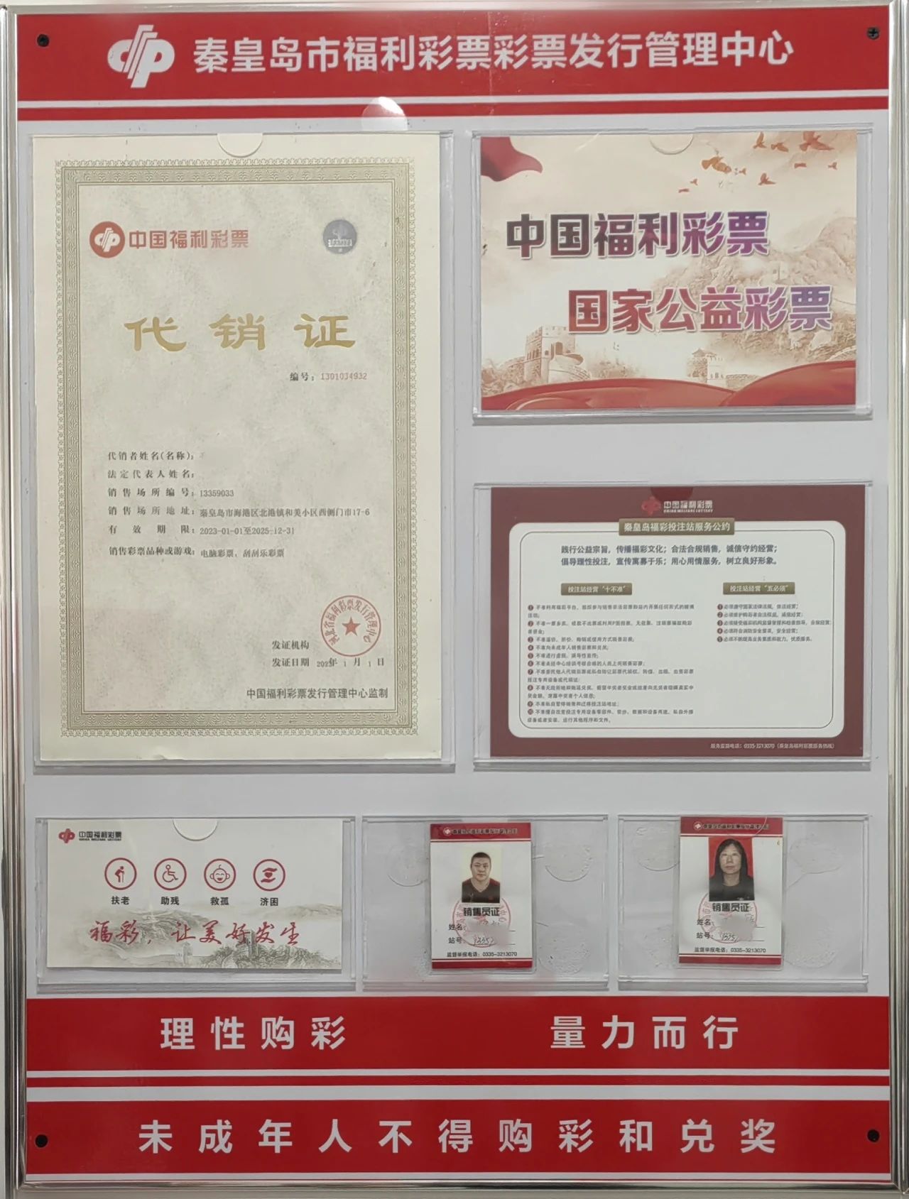 信息公开栏,向广大群众公开展示销售网点代销证、销售网点服务公约、销售员信息、监督举报电话、警示标语等内容。不仅为购彩者直观展示网点合法经营资质,也明确了秦皇岛市福彩销售网点服务内容和中国福利彩票的责任彩票理念。彰显销售网点的专业性和公信力,提升公众对福利彩票的信任度。
