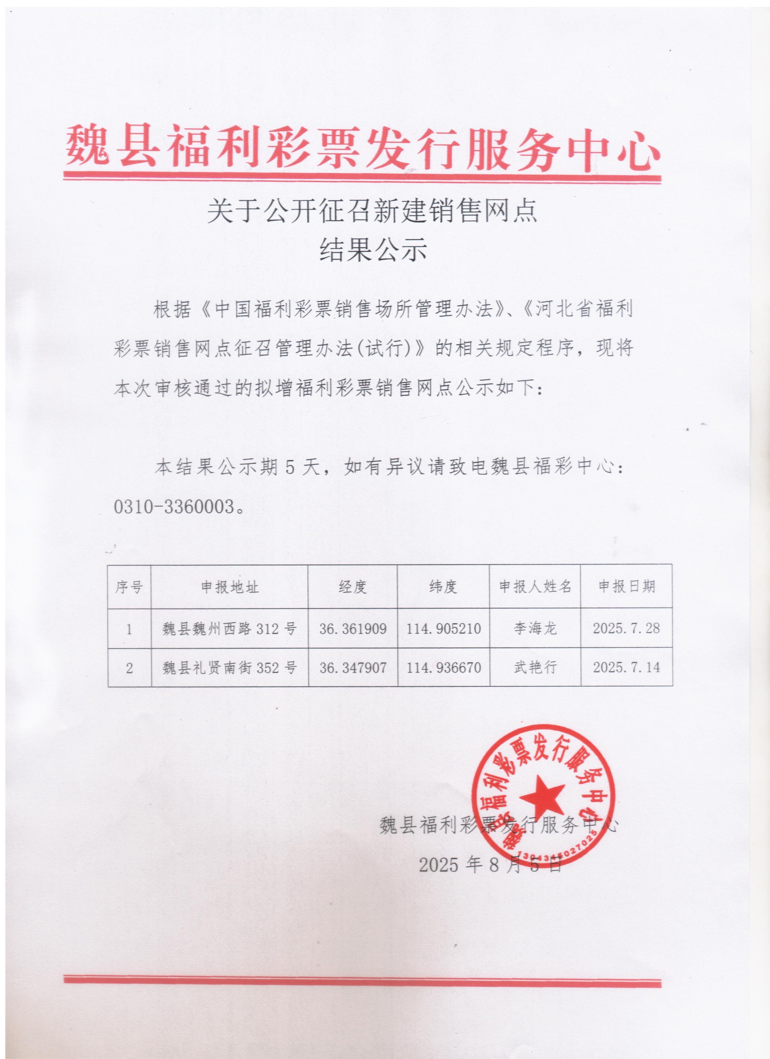 【公告】关于公开征召新建销售网点结果公示(魏县)