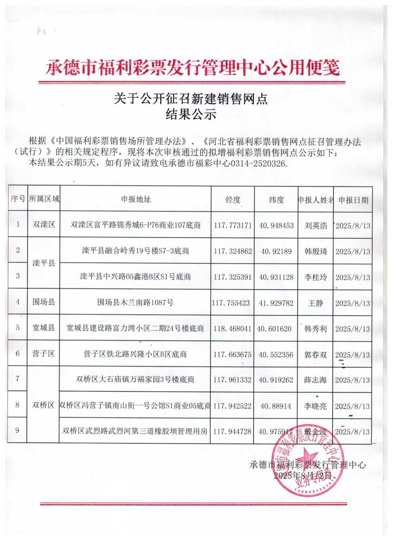 【公告】关于公开征召新建销售网点结果公示(承德)