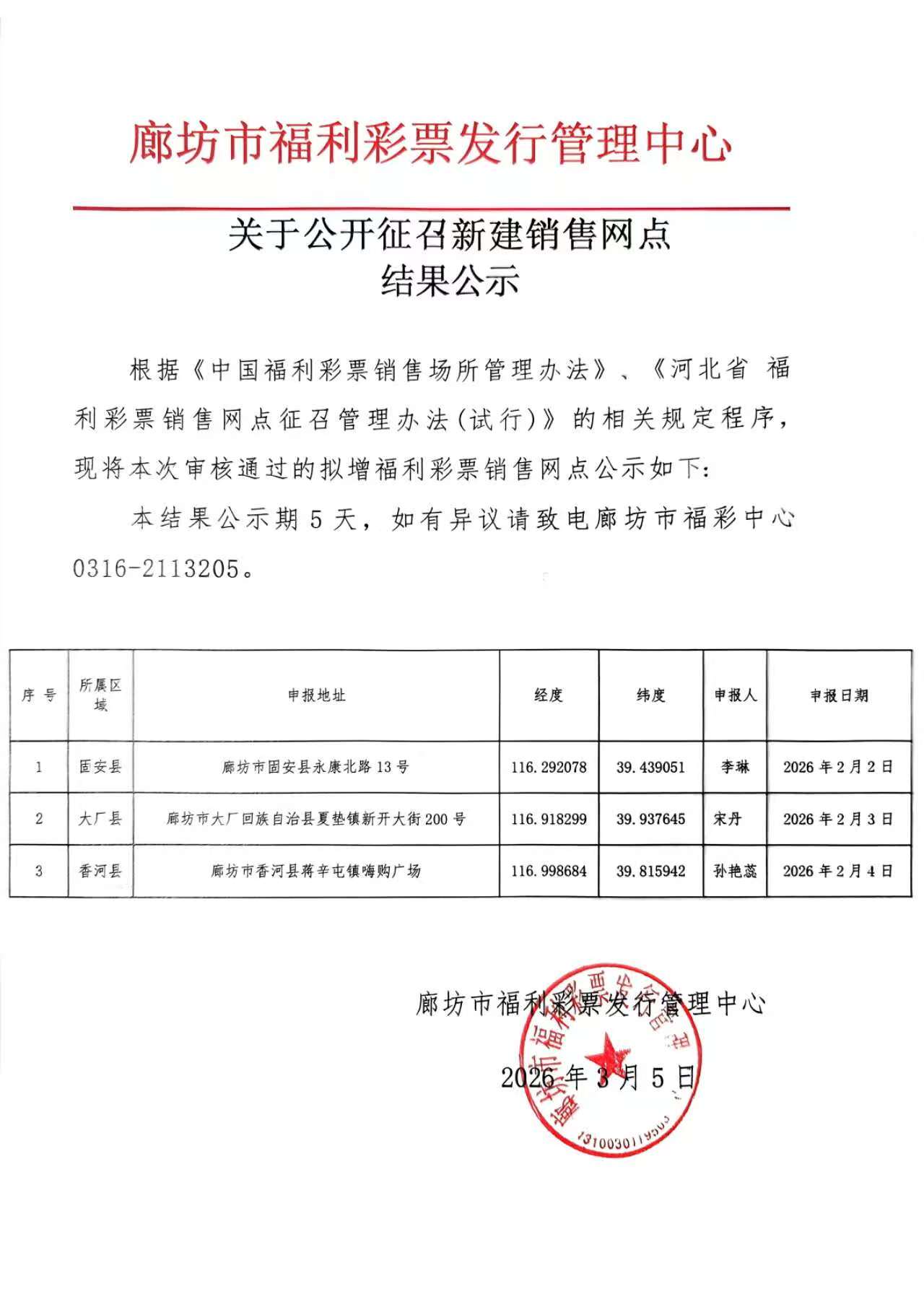 【公告】关于公开征召新建销售网点结果公示(廊坊)