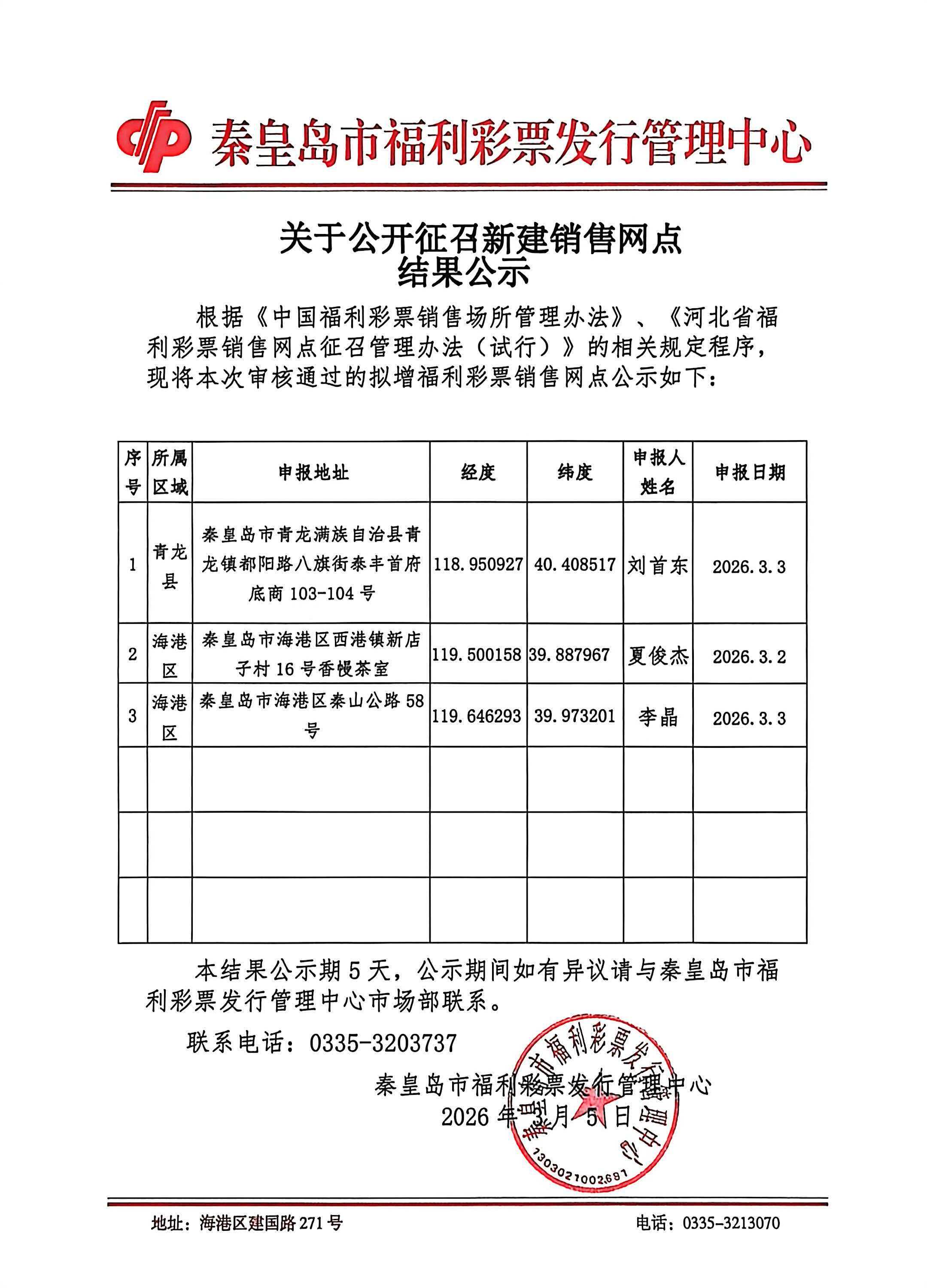 【公告】关于公开征召新建社会渠道即开票销售网点结果的公示(秦皇岛)