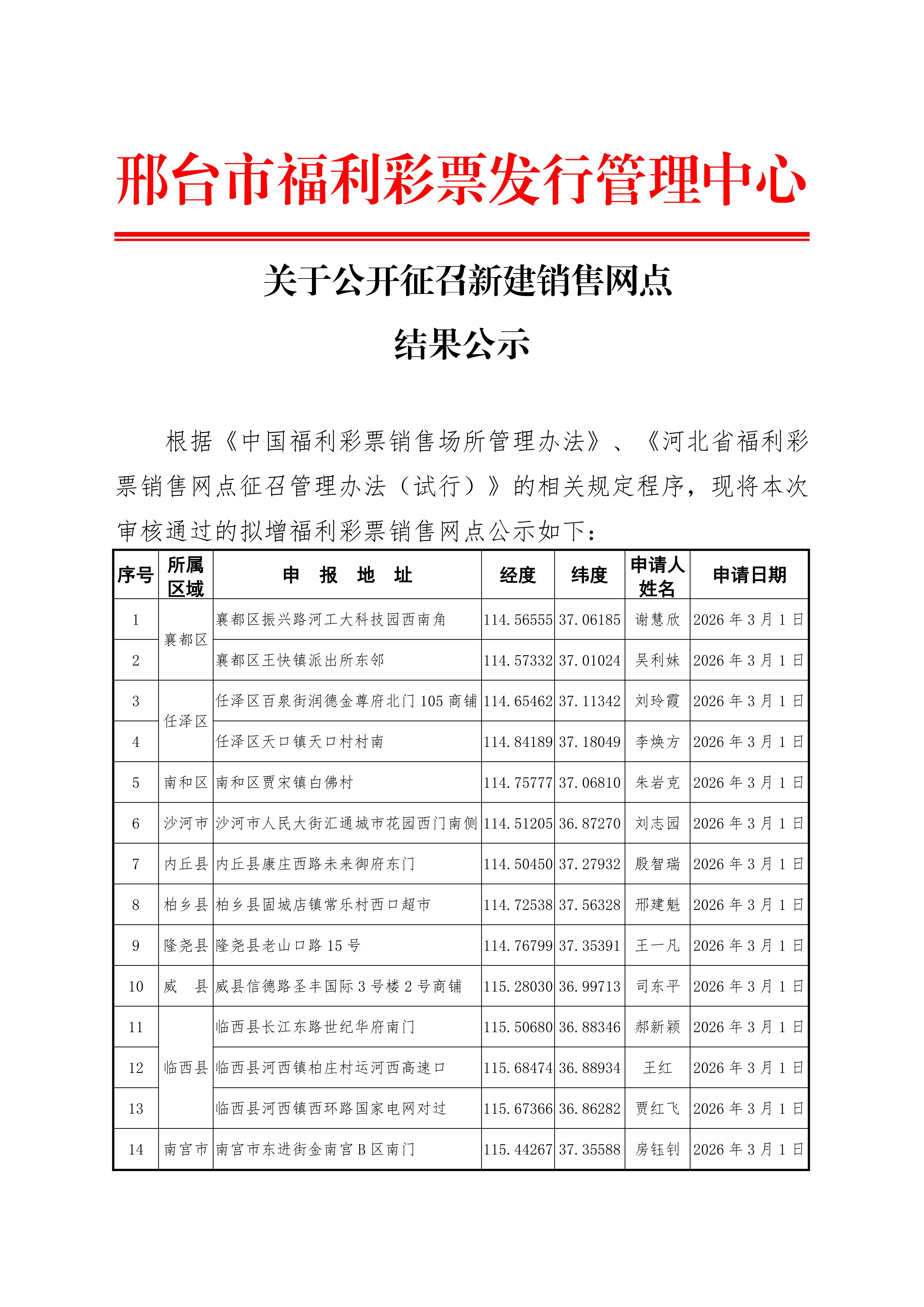 【公告】关于公开征召新建社会渠道即开票销售网点结果的公示(石家庄)