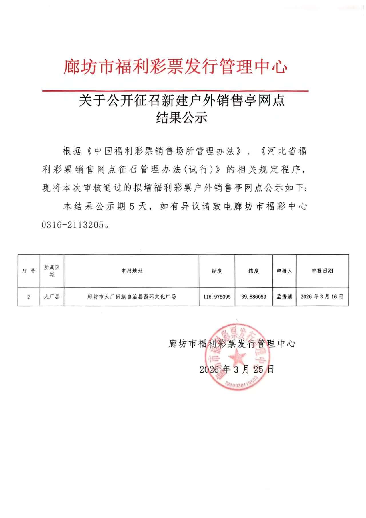 【公告】关于公开征召新建户外销售亭网点结果公示(廊坊)