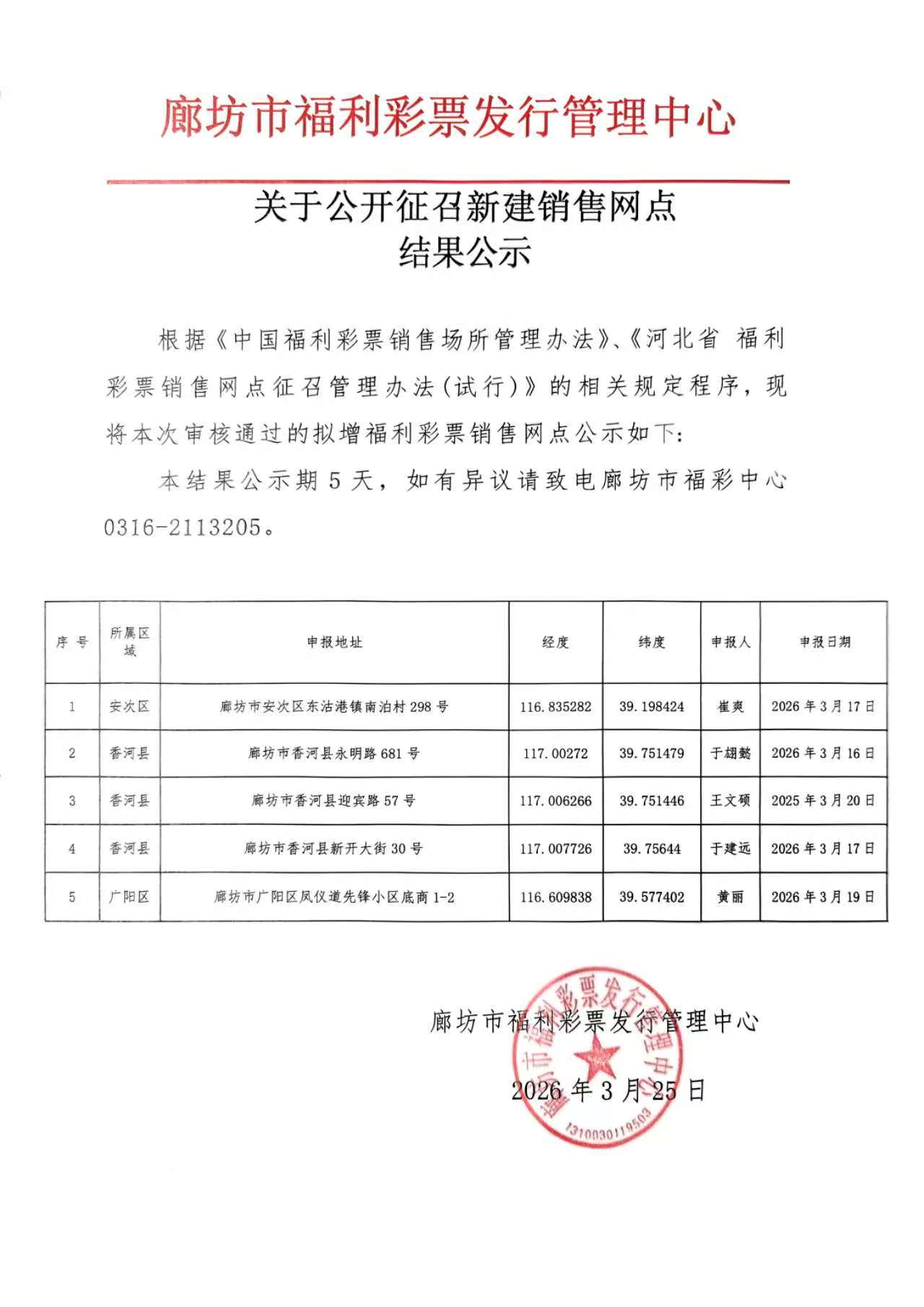 【公告】关于公开征召新建销售网点结果公示(廊坊)
