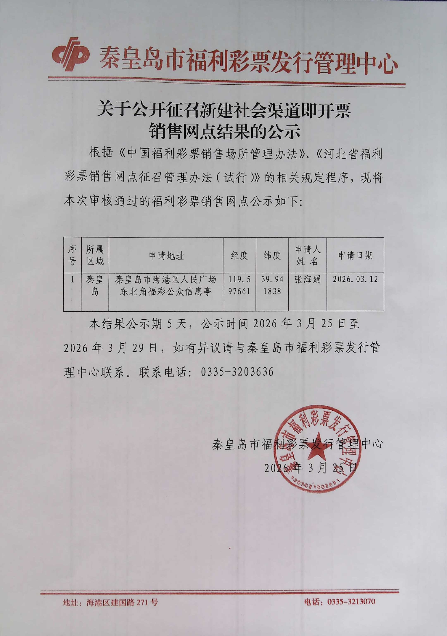 【公告】关于公开征召新建社会渠道即开票销售网点结果的公示(秦皇岛)