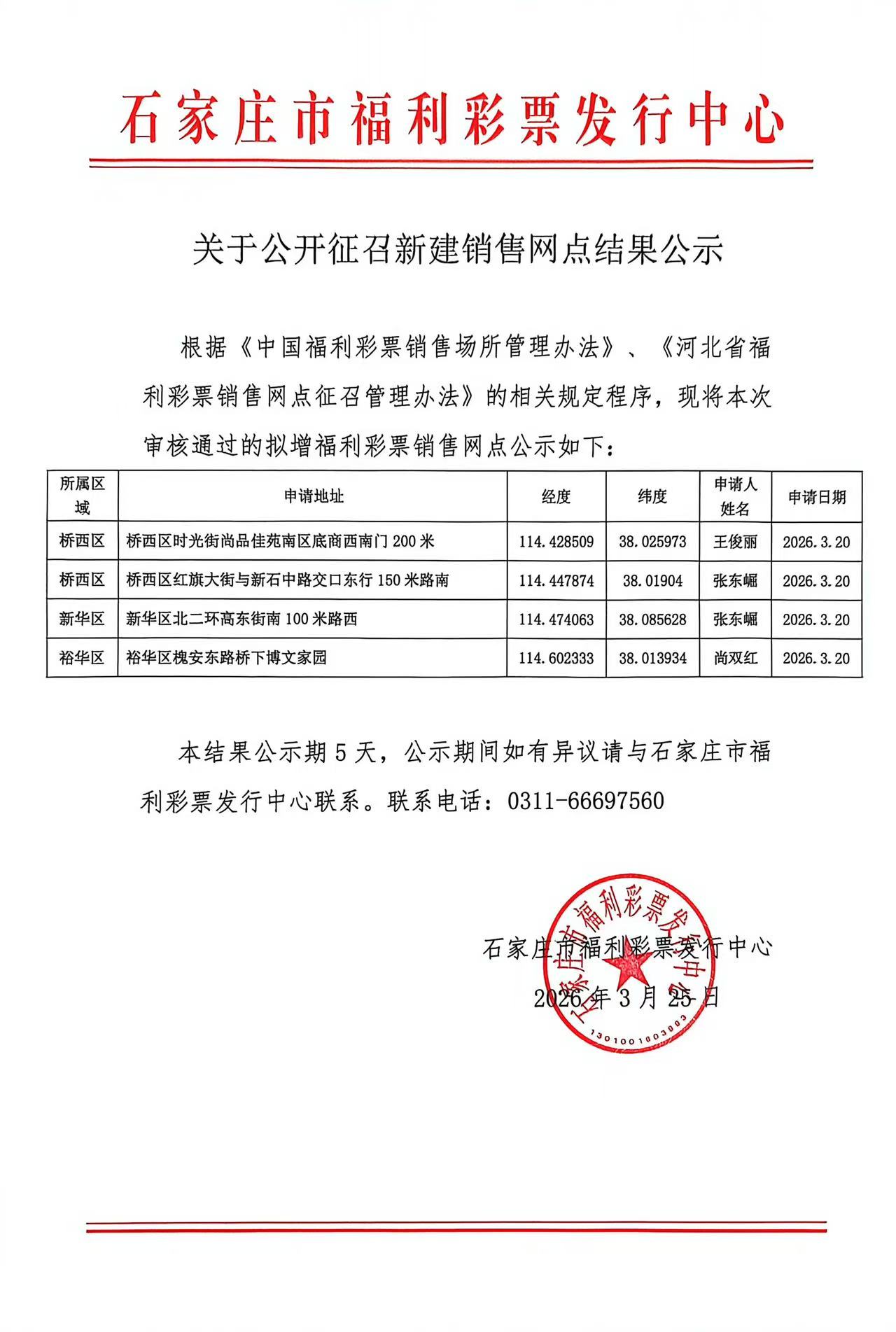 【公告】关于公开征召新建社会渠道即开票销售网点结果的公示(石家庄)