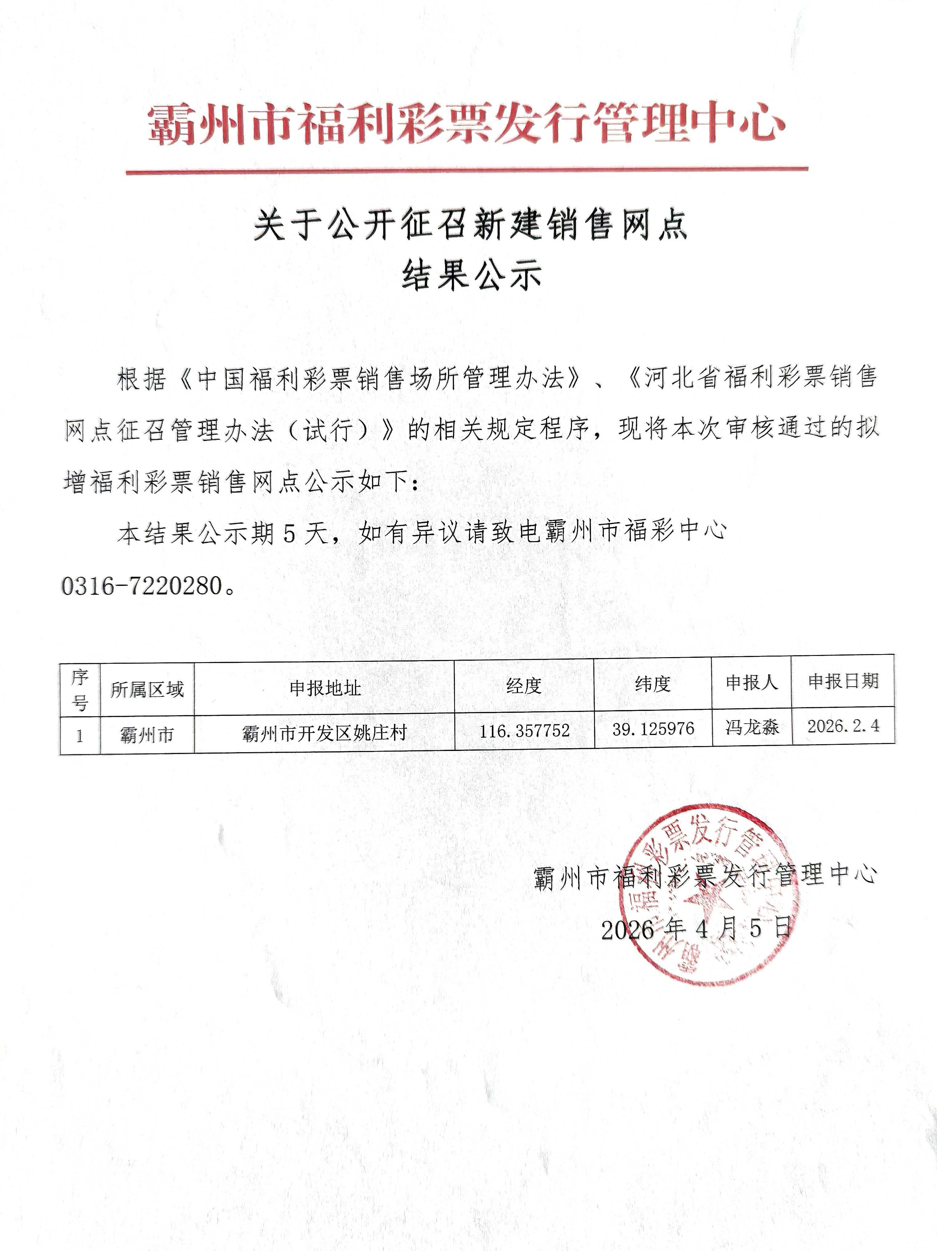 【公告】关于公开征召新建销售网点结果公示(霸州)