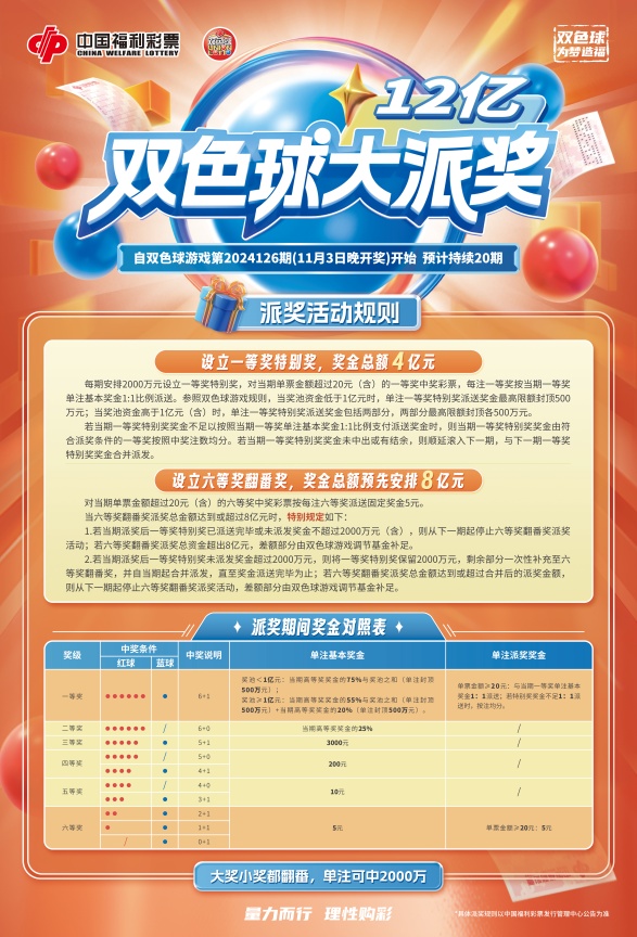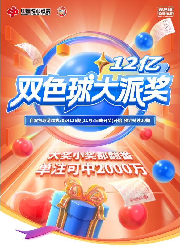 自双色球游戏第2024126期(2024年11月3日晚开奖)开始,预计持续派奖20期。
