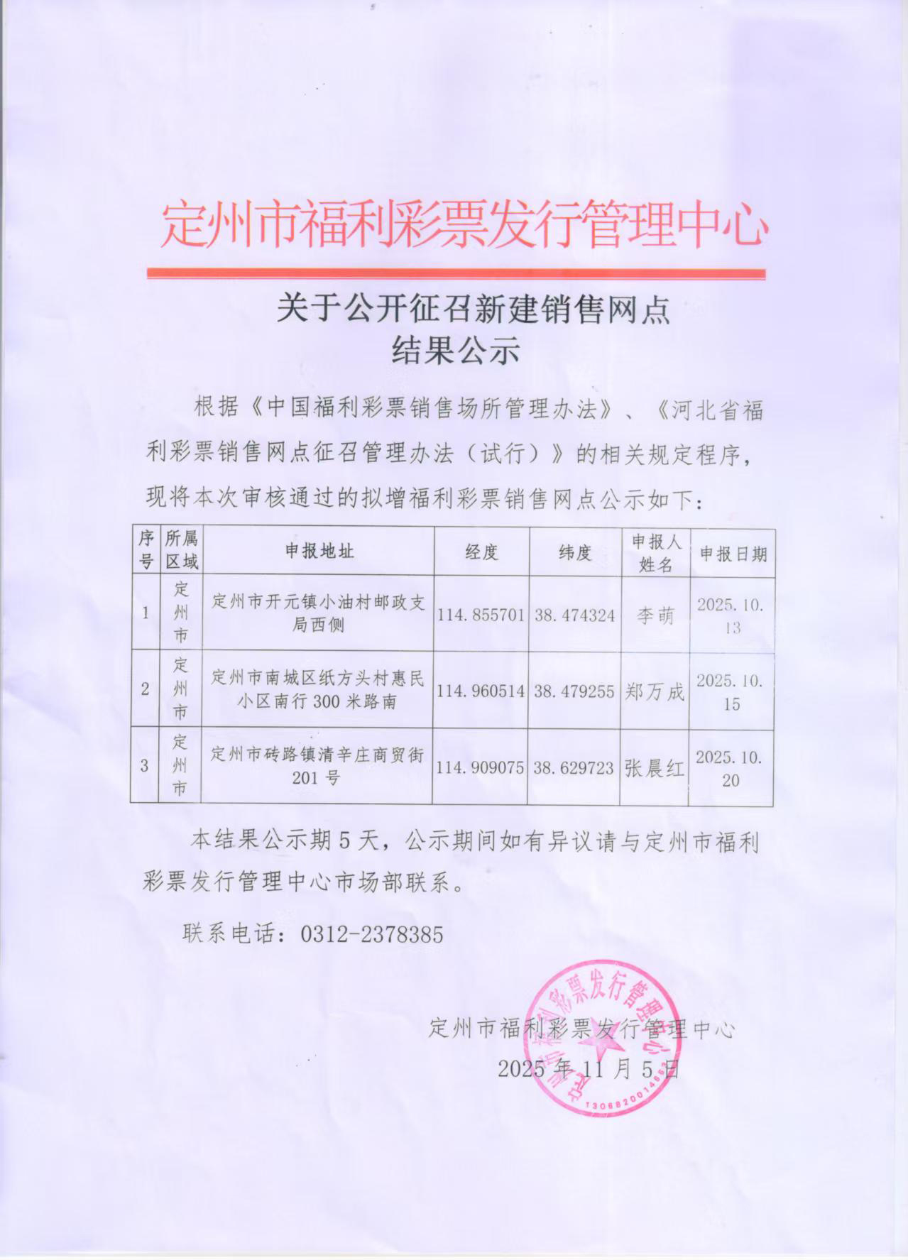 【公告】关于公开征召新建销售网点结果公示(定州)