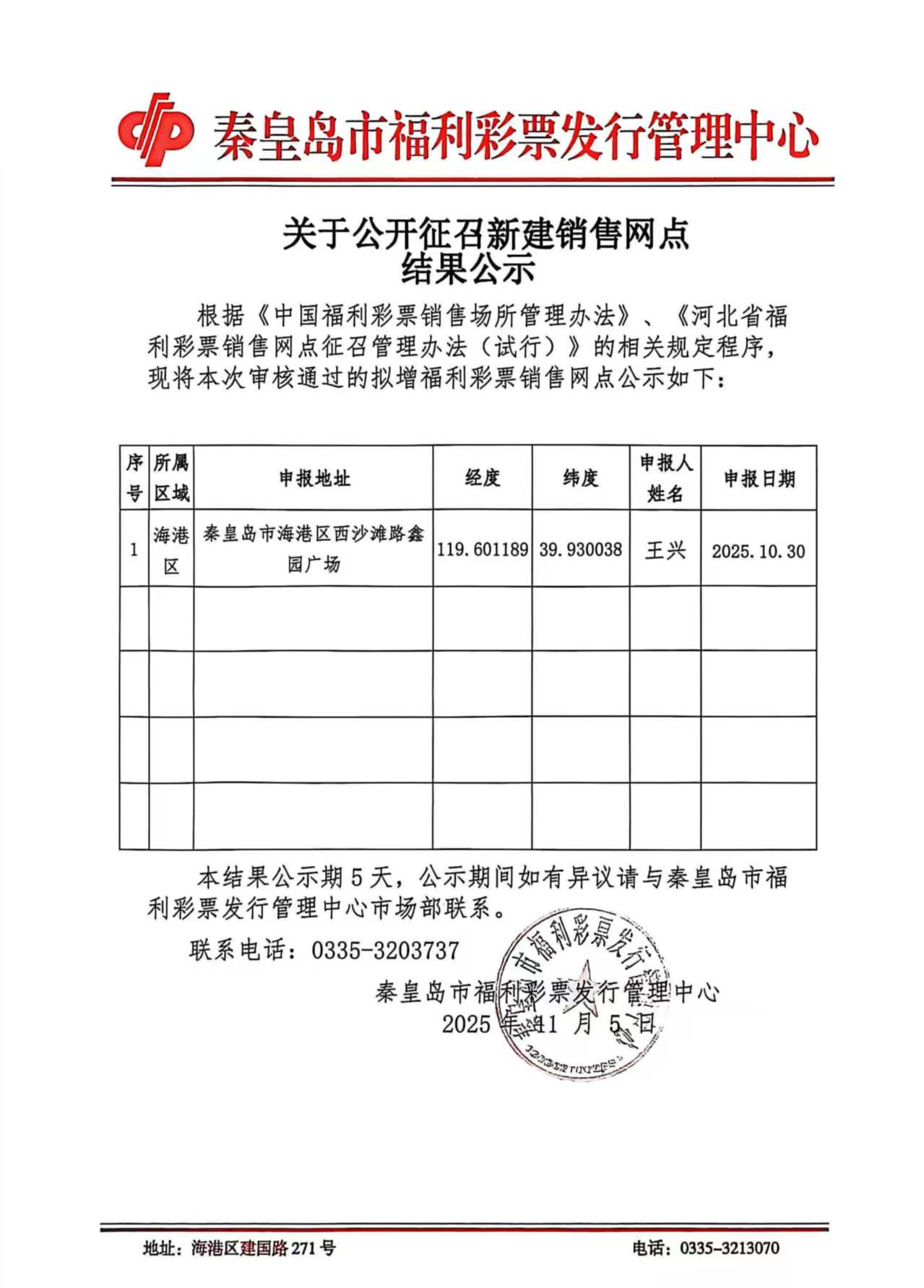 【公告】关于公开征召新建销售网点结果公示(秦皇岛)