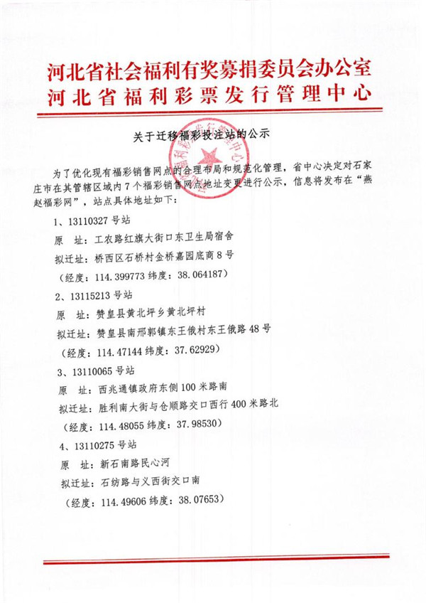 【公告】关于石家庄迁移福彩投注站的公示