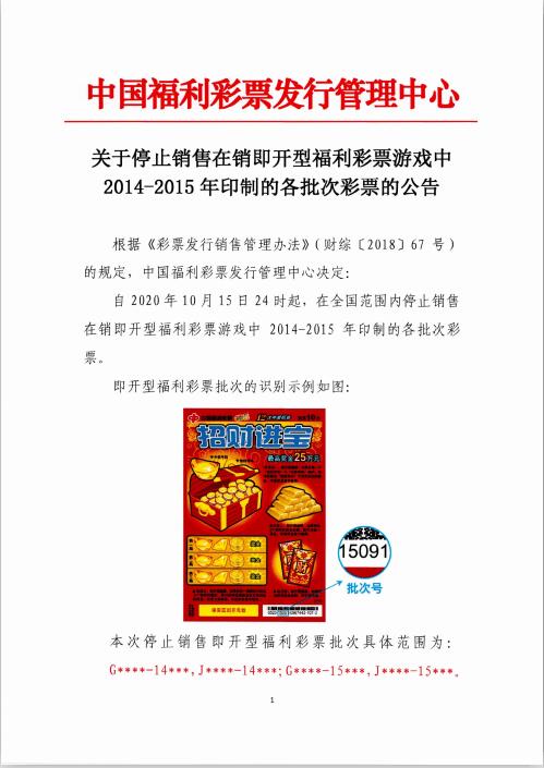 / 【公告】关于停止销售在销即开型福利彩票游戏中2014-2015年印制的各批次彩票的公告
