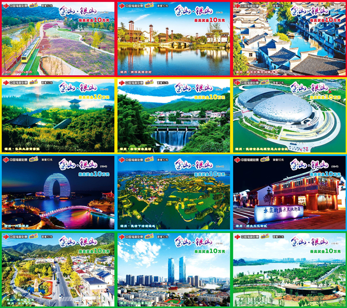 “金山·银山”彩票采用明信片形式设计,共有12枚票面。这款彩票以“绿水青山就是金山银山”为主题,选取“两山”理念诞生地安吉余村、南浔古镇百间楼、月亮酒店、历史文化街区等12处特色风景作为票面,将浙江省湖州市的生态环境、人文景观设计等通过彩票呈现给全国彩民,因此具有浓郁的地方特色。考虑到刮奖的同时不至于破坏票面的整体美感,该款彩票刮开区别出心裁的设计在了背面。对于彩票爱好者来说,该款彩票还具有一定的收藏价值。
