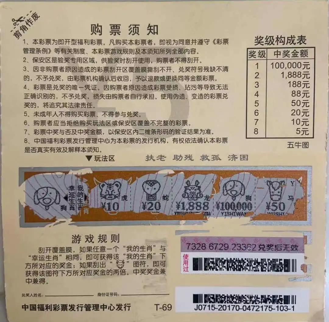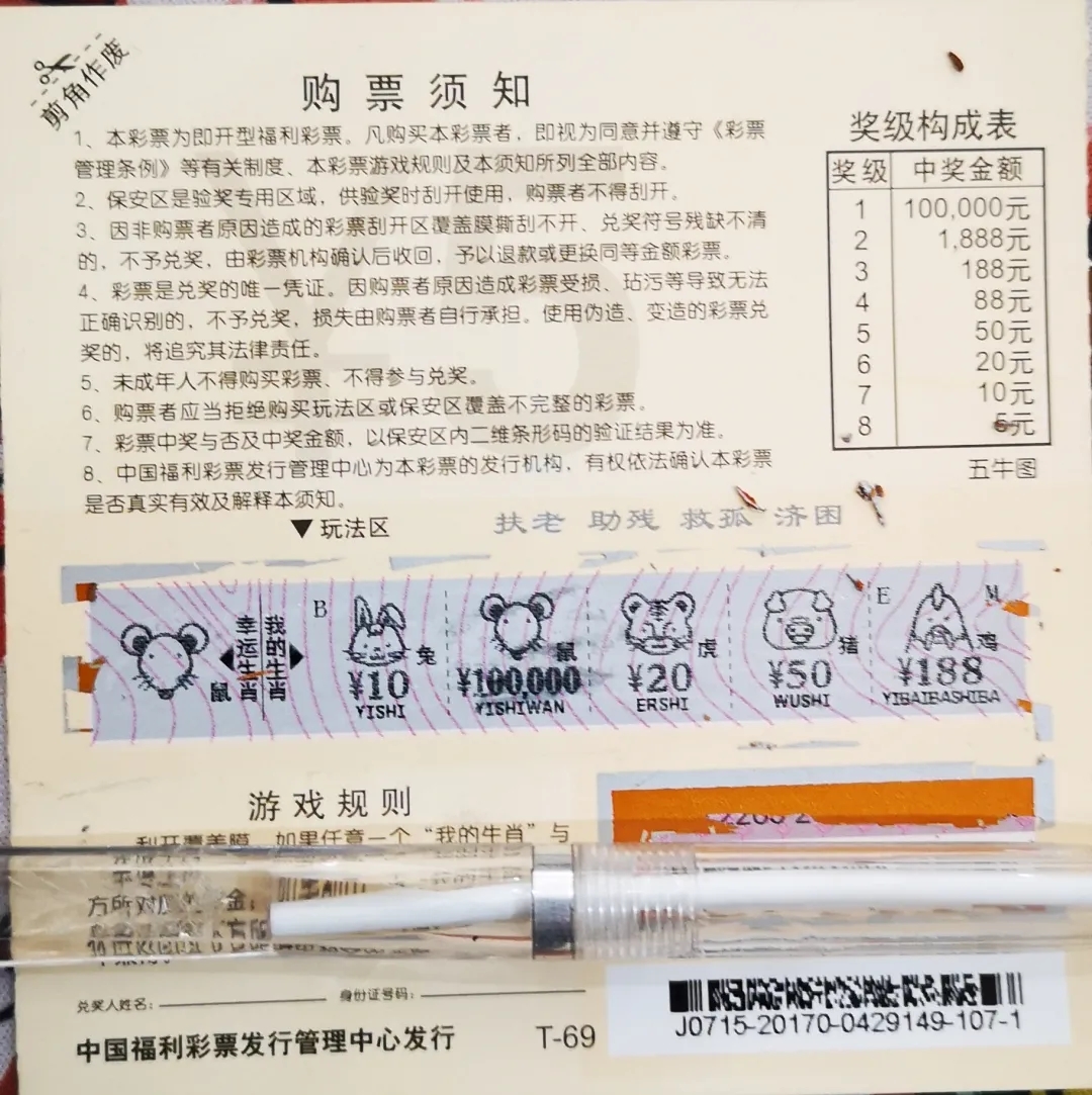4月8日下午,秦皇岛市北戴河区13359046投注站销售员吴先生(化姓),闲暇时看见桌子上还有4张“五牛图”彩票未售出,便临时起意自己刮了起来。其中一张刮开后,“幸运生肖”显示的是“老鼠”图符,而“我的生肖”中“老鼠”图符也赫然纸上,根据游戏规则,如果任意一个“我的生肖”与“幸运生肖”相同,即可获得下方对应奖金。吴先生因此中出了“五牛图”最高奖金10万元。