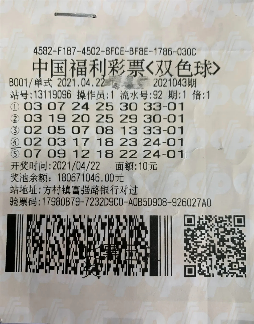 4月22日,双色球2021043期开出3注一等奖,单注奖金1000万元,其中1注出自石家庄市栾城区方村镇富强路银行对过13119096站。第二天上午,一位老先生出现在省福彩中心兑奖大厅,他出示的正是1000万大奖彩票。