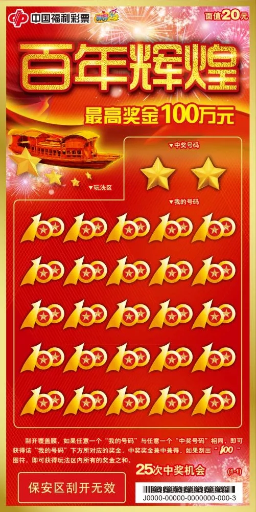 “百年辉煌”彩票面值20元,共有9个奖级、25次中奖机会,最高奖金100万元。