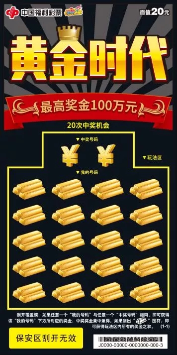 “黄金时代”彩票面值20元,共有11个奖级、20次中奖机会,最高奖金100万元。