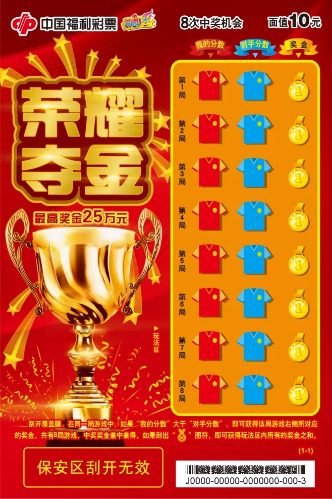 “荣耀夺金”彩票面值10元,共有8级个奖级,8次中奖机会,最高奖金25万元。