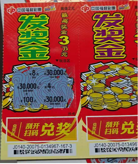 据站主介绍,小夫妻中的男士酷爱刮刮乐,每次来彩票站都会买上几张试试手气。5日,他和妻子一同来到彩票站,一进门,他就选了两张“牛气冲天”,刮出50元奖金。他的妻子则喜欢面值2元的“发奖金”,花10元选了5张。刮到第4张时,玩法区内3个“30000元”跃然眼前,按照游戏规则,她获得了3万元奖金。女士按耐不住激动的心情,高兴地说:“感谢福彩给我送上了这份大奖,我会一直支持福彩公益事业的。”(齐正 肖立国 刘建达 史晶晶)