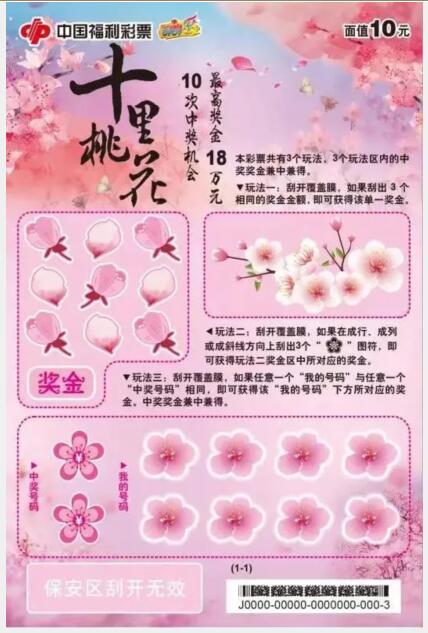 “十里桃花”彩票面值10元,共设8个奖级、10次中奖机会,最高奖金18万元。