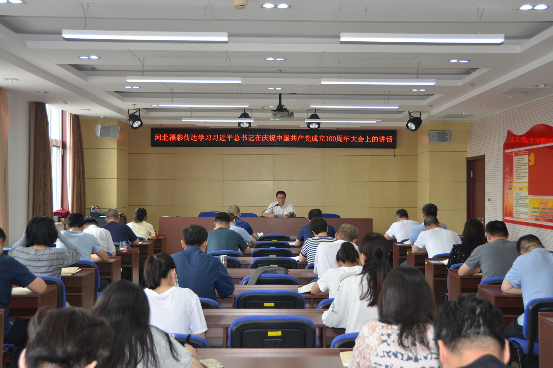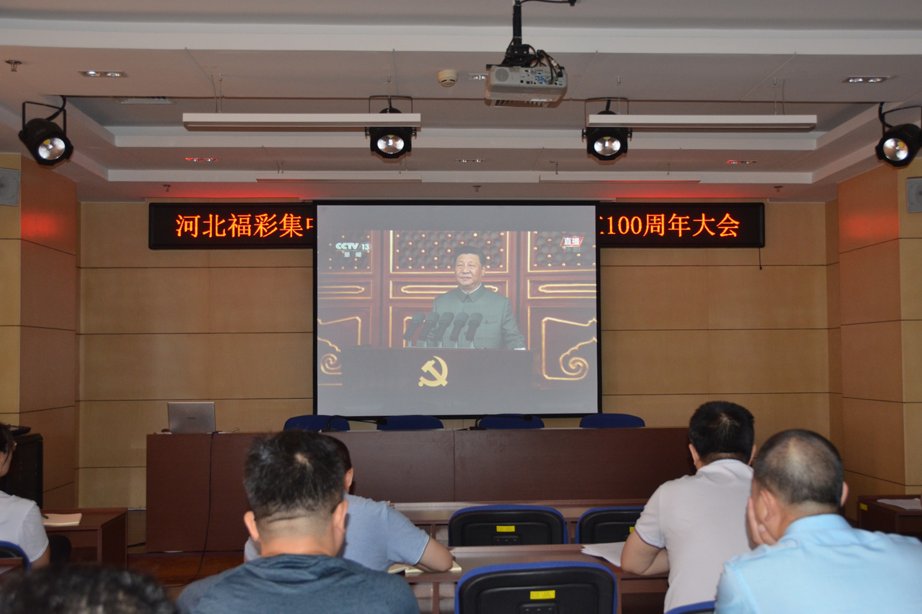 7月1日上午8时,庆祝中国共产党成立100周年大会在北京天安门广场举行。习近平总书记发表重要讲话。省福彩中心全体党员干部群众集中收听收看习近平总书记的重要讲话和大会盛况。收听收看现场秩序井然,大家坐姿整齐、认真聆听。习近平总书记的重要讲话在党员干部群众中反响强烈。大家表示,要认真学习领会习近平总书记重要讲话精神内涵,坚定理想信念、坚守初心使命,不断从百年党史中汲取智慧和力量,攻坚克难、砥砺前行,为实现福彩事业高质量发展做出新贡献。