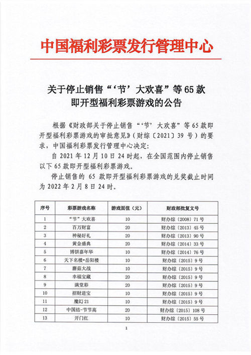 【公告】关于停止销售“‘节’大欢喜”等65款即开型彩票游戏的公告