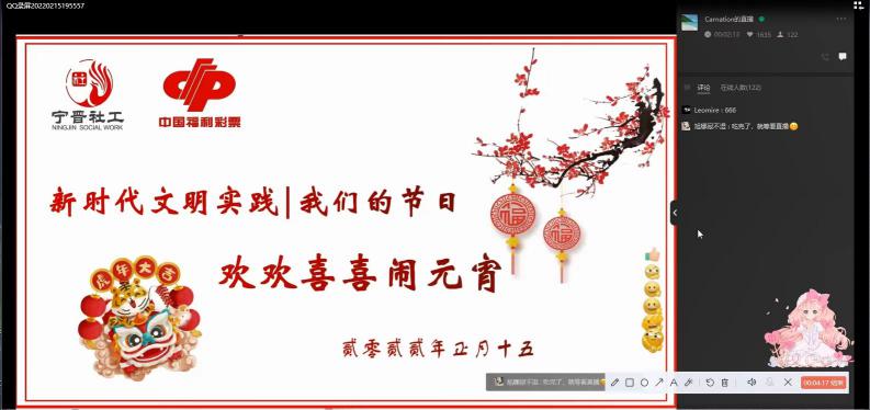 2月15日,是中华民族的传统节日元宵节。当天,宁晋县福彩中心联合县民政局爱民社工服务中心举办了“福彩助力——我们的节日,欢欢喜喜闹元宵”线上猜灯谜活动。