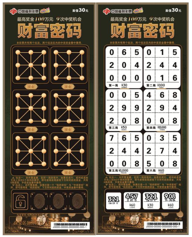 “财富密码”彩票设计可谓是匠心独运:整体票面犹如一扇厚重的大门,墨绿色与黑色相间的主色调、金色点线构成的九宫格、时下流行的指纹密码锁、闪闪发光的金币,凸显了这扇“财富之门”的高级感和神秘感。6组九宫格和3组指纹密码锁背后,是等待挖掘的财富宝藏。无论是“我的密码”和“中奖密码”刮出相同的数字,还是同一局游戏中成行、成列或者斜连的3个数字相同,都可以获得对应的奖金。