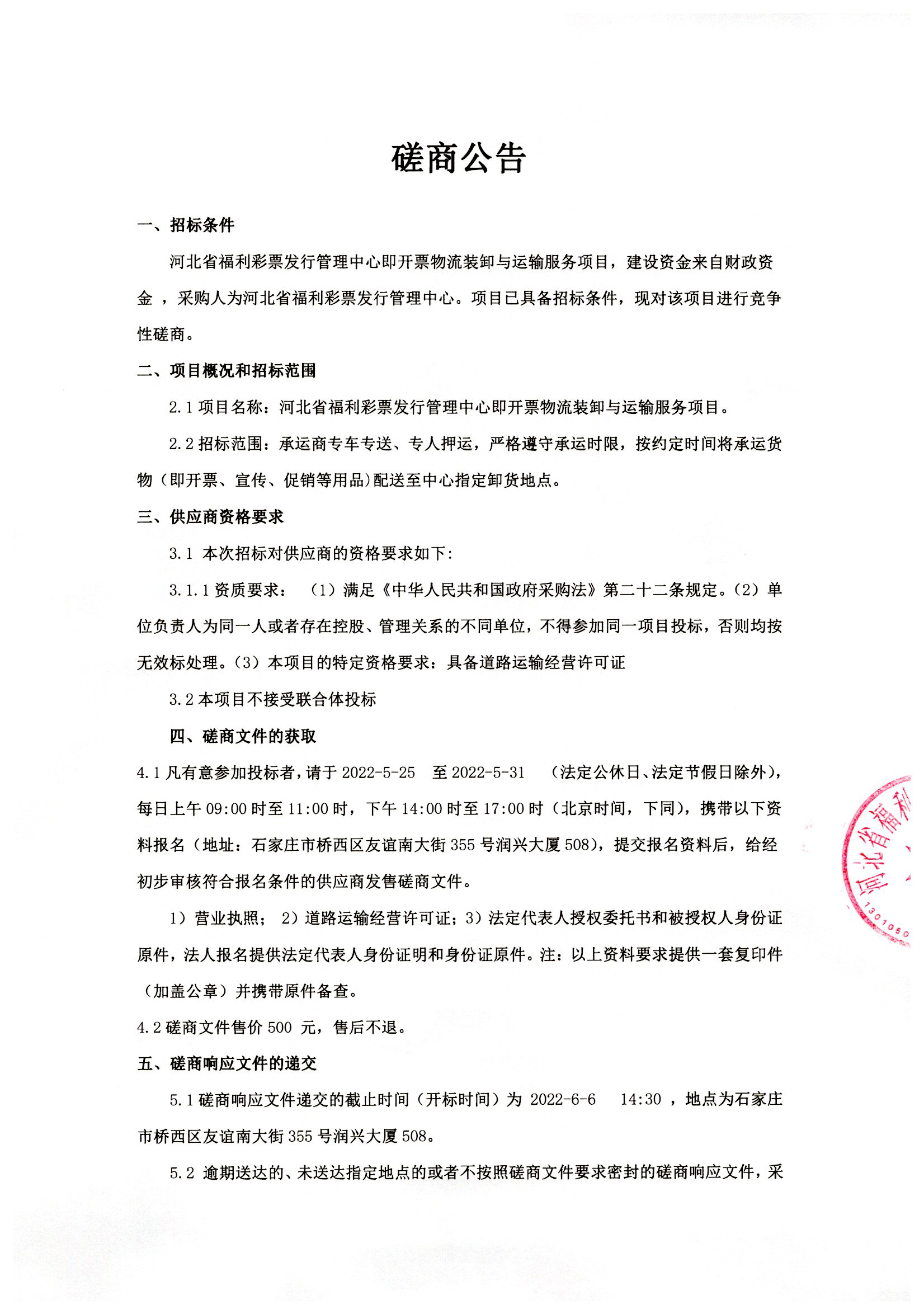 / 【公告】河北省福利彩票发行管理中心即开票物流装卸与运输服务项目二次磋商公告