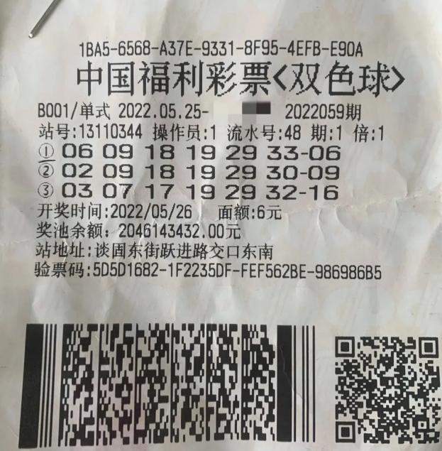 5月26日,双色球2022059期,石家庄市长安区谈固东街与跃进路交口13110344站一位购彩者投注一张6元3注单式票中一等奖1注,单注奖金571.4126万元。5天后,一位年逾七旬的老人在家人陪同下领奖。