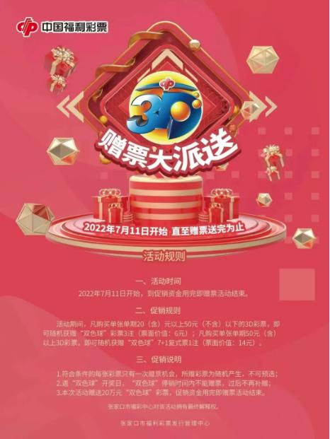 为回馈广大购彩者对福利彩票的支持与厚爱,进一步提升3D游戏品牌影响力,张家口市福彩中心决定,自7月11日起,在全市范围内开展买3D游戏赠双色球彩票活动。