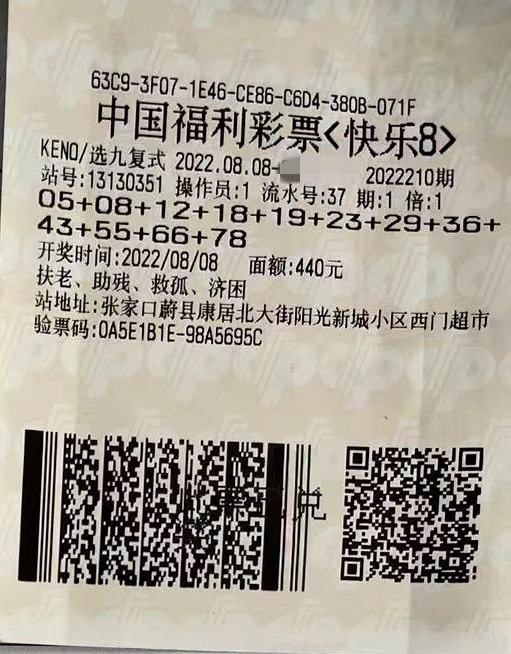 8月8日,快乐8第2022210期,张家口市蔚县康居北大街阳光新城小区第13130351号销售网点购彩者赵先生(化姓)投注一张12码选九复式票,中出“选九中九”1注、“选九中八”27注、“选九中七”108注、“选九中六”84注,奖金合计37.728万元。这是自5月份以来张家口市第二次中出快乐8游戏10万元以上大奖。