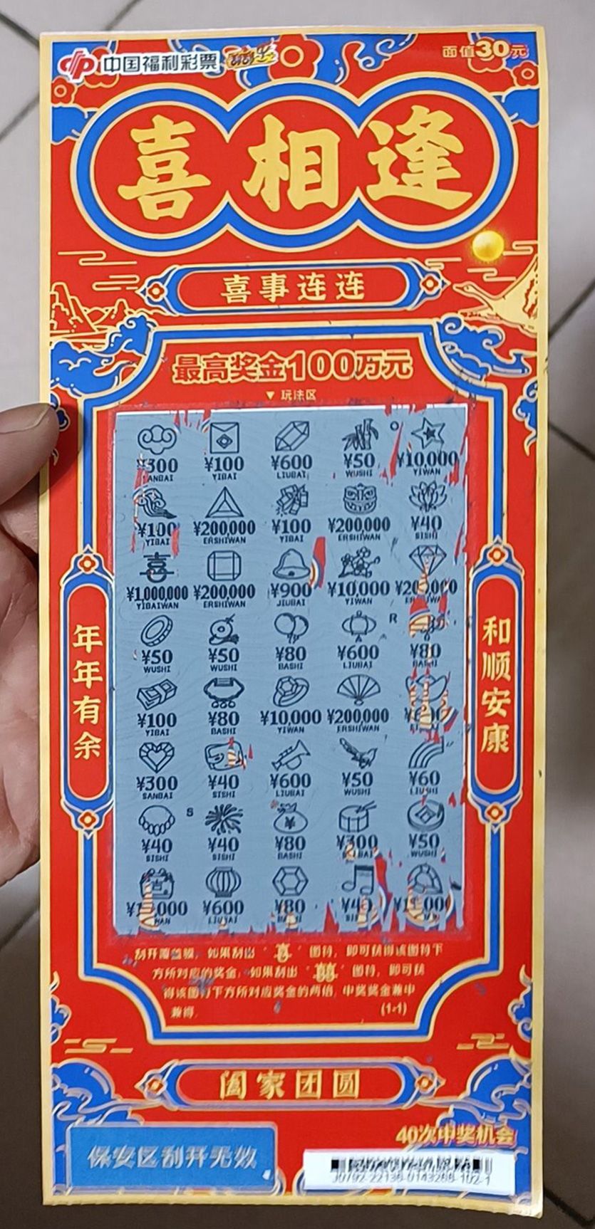游戏规则:刮开覆盖膜,如果刮出“喜”字图符,即可获得该图符下方所对应的奖金;如果刮出“囍”图符,即可获得该图符下方所对应奖金的两倍。中奖奖金兼中兼得。(史晶晶)