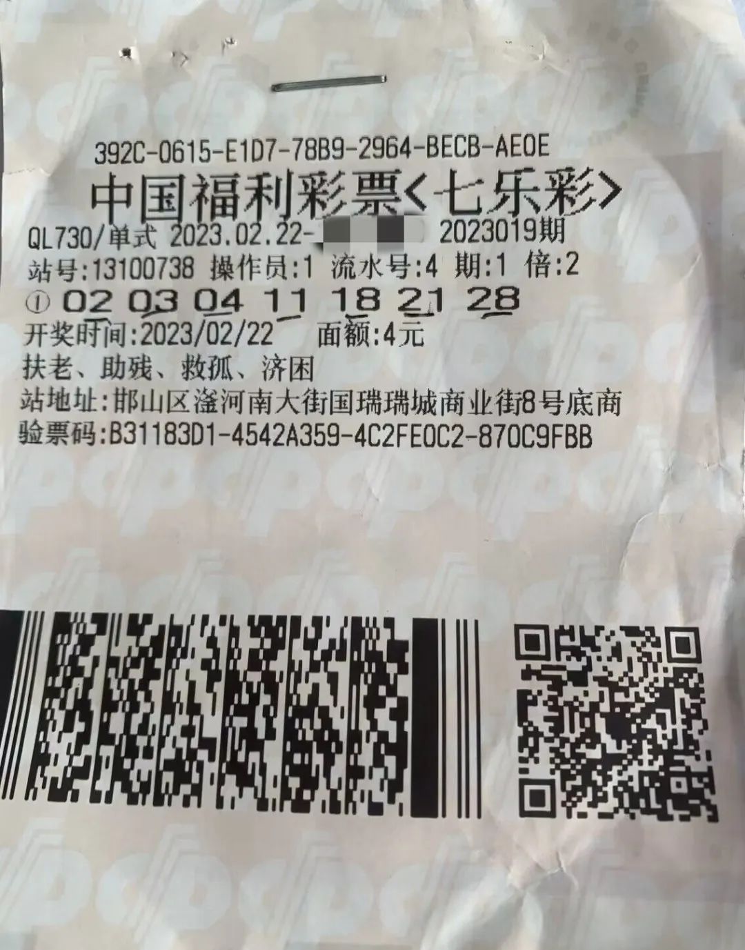 2月22日,七乐彩第2023019期,邯郸市邯山区滏河南大街国瑞·瑞城商业街13100738号销售网点购彩者凭借一张1注2倍单式票中出2注一等奖,奖金合计61.2576万元。2月27日下午,一位七旬老太在家人陪同下来到省福彩中心办理了兑奖手续。