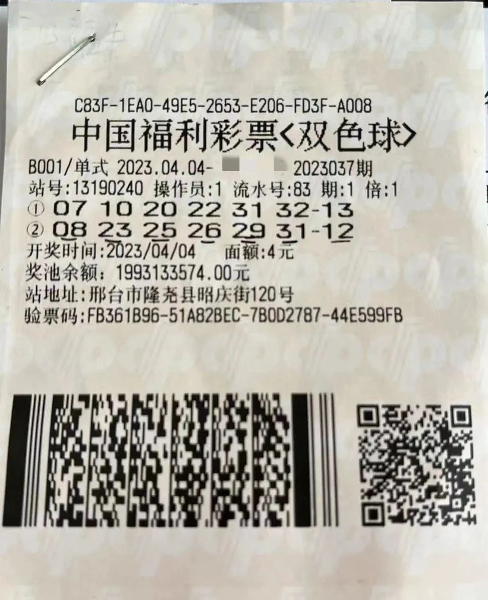 4月4日,双色球第2023037期,邢台市隆尧县昭庆街13190240号销售网点一位购彩者凭借一张4元2注单式票中出一等奖1注,单注奖金597.8413万元。4月7日上午,大奖得主在两位亲属陪同来到省福彩中心,其中一位年轻人出面代为办理了兑奖手续。