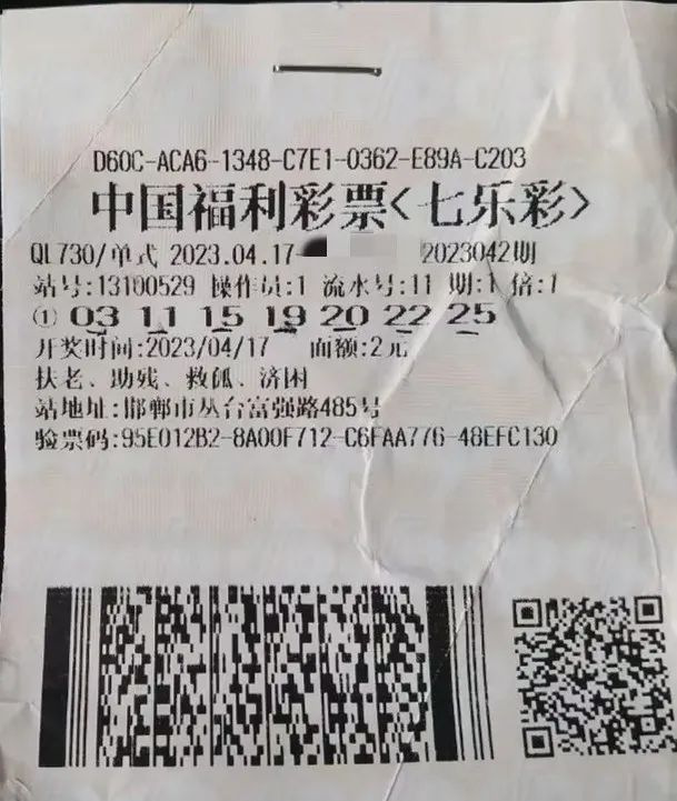 4月17日,七乐彩第2023042期,邯郸市丛台区富强路13100529号销售网点购彩者钱先生(化姓)2元投中一等奖1注,单注奖金106.6193万元。4月19日下午,钱先生独自来到了省福彩中心领奖。