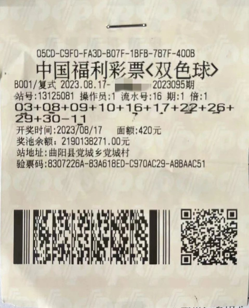 8月17日晚,双色球2023095期开奖,保定市曲阳县党城乡党城村13125081号销售网点12位购彩者合买一张10+1复式票,中一等奖1注、三等奖24注、四等奖90注、五等奖80注、六等奖15注,奖金合计584.1879万元。第二天上午,5081号网点销售员吕女士作为代表出面领奖。
