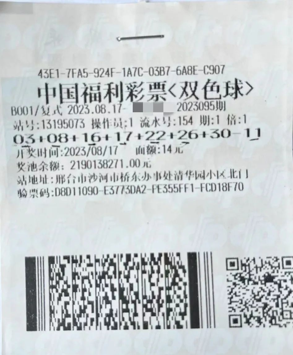 8月17日,双色球2023095期开奖,沙河市桥东办事处清华园小区13195073号销售网点购彩者投注一张7+1复式票,中出一等奖1注、三等奖6注,奖金合计576.9004万元。第二天上午,赵先生(化姓)就早早来到省福彩中心门外等待领奖。