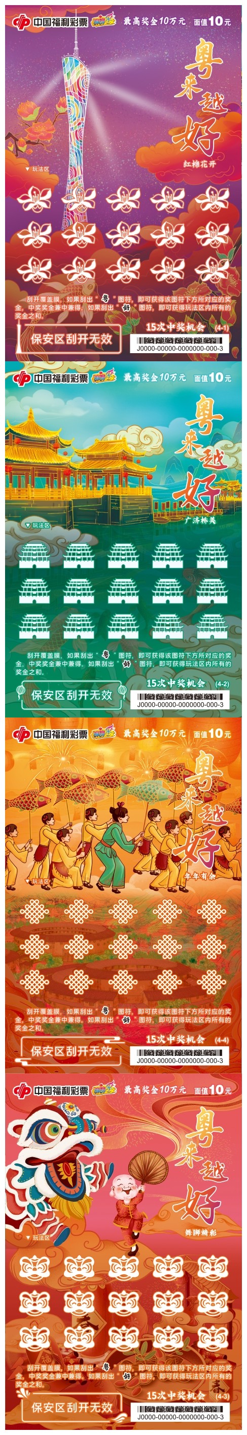 刮刮乐“粤来越好”谐音“越来越好”,展现了广东珠三角、粤东、粤西和粤北四个区域不同的风土特色。一张张票面上,岭南文化栩栩如生,一个活力四射朝气蓬勃的广东展现在购彩者眼前。