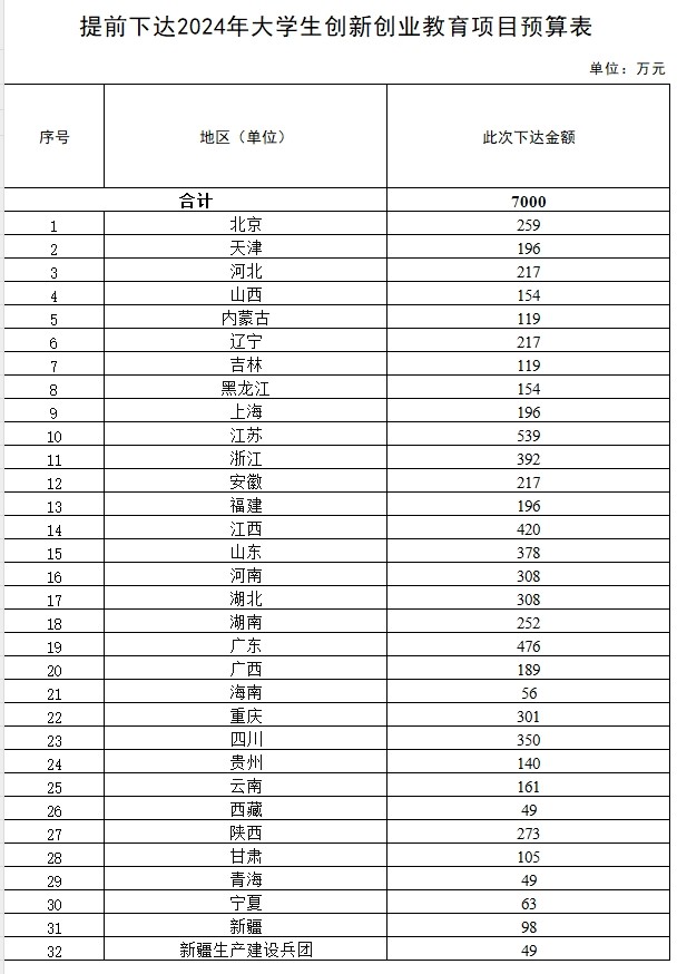 《通知》指出,为提高预算完整性,加快支出进度,支持大学生创新创业教育发展,现提前下达2024年大学生创新创业教育项目预算7000万元,用于支持各地依托省内高校建设国家级创新创业学院、国家级创新创业教育实践基地。