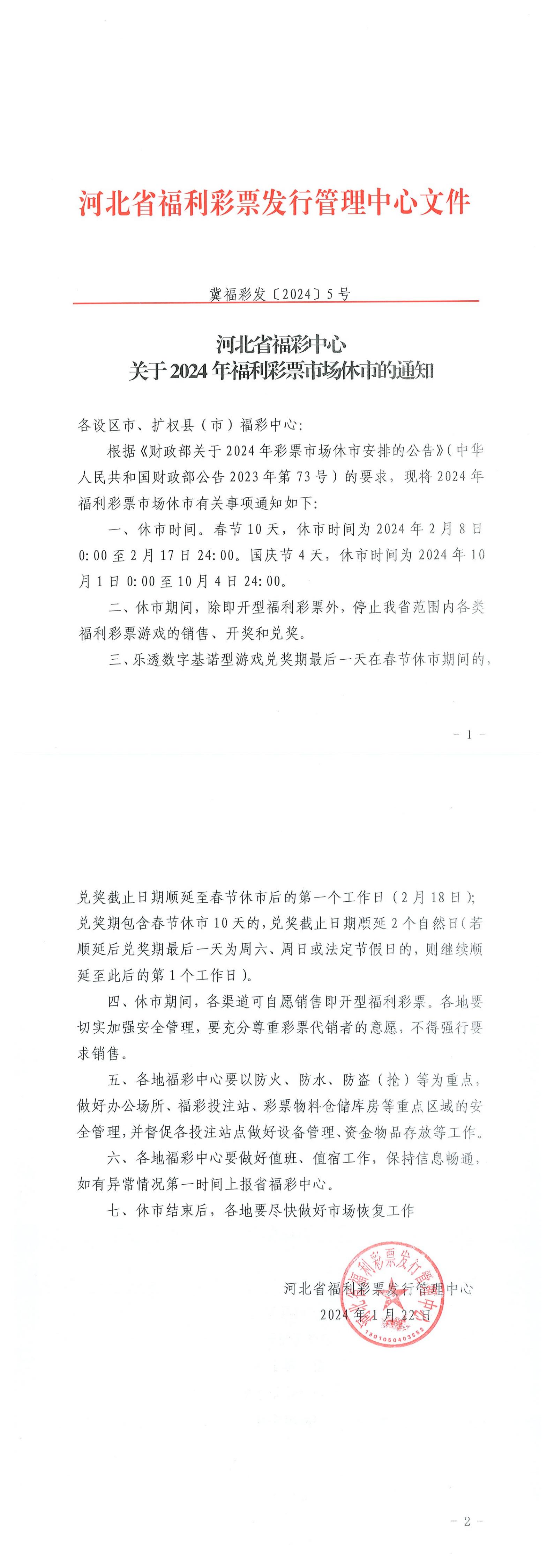 / 【通知】河北省福彩中心关于2024年福利彩票市场休市的通知