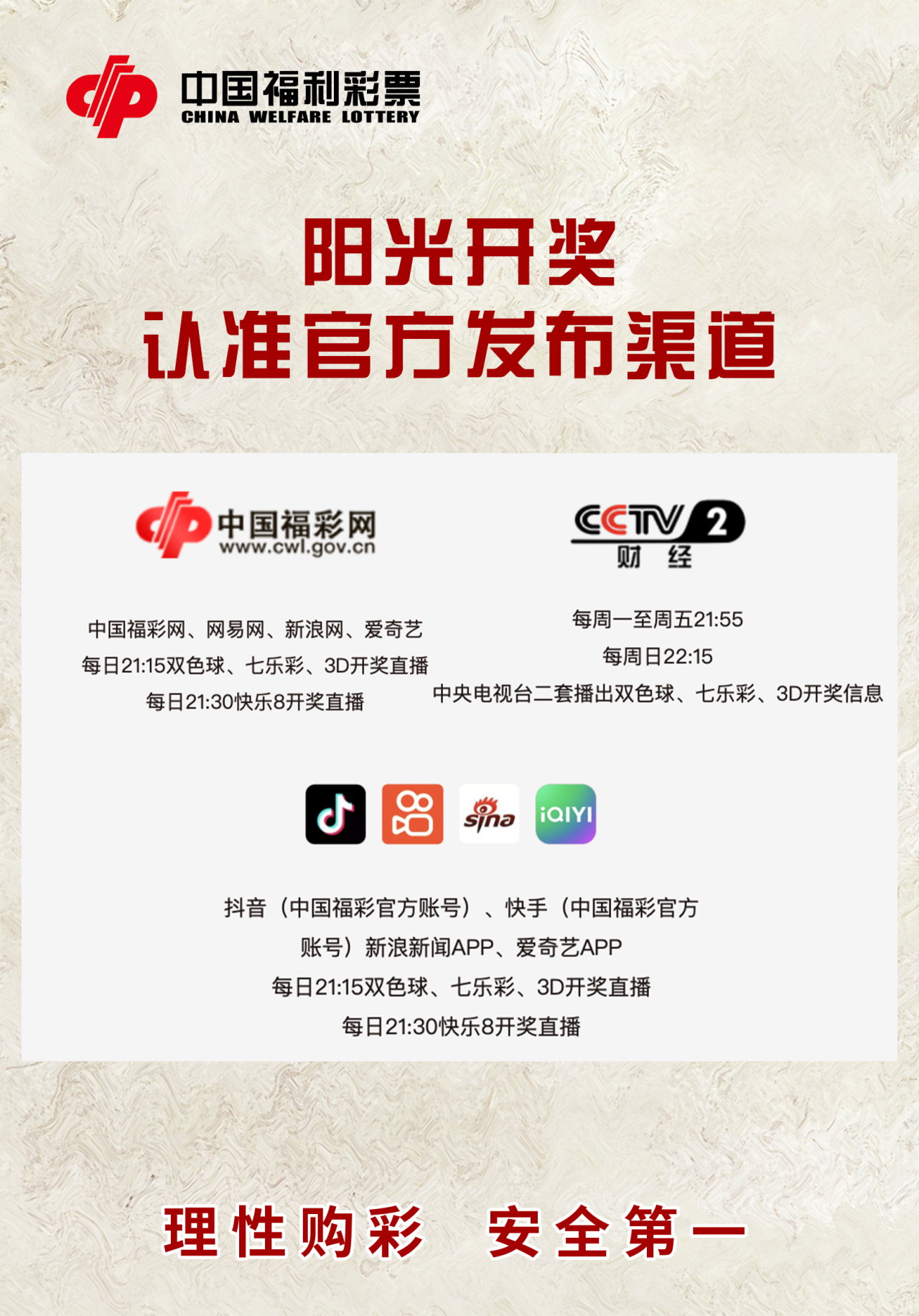 抖音(中国福彩官方账号)、快手(中国福彩官方账号)、新浪新闻APP、爱奇艺APP